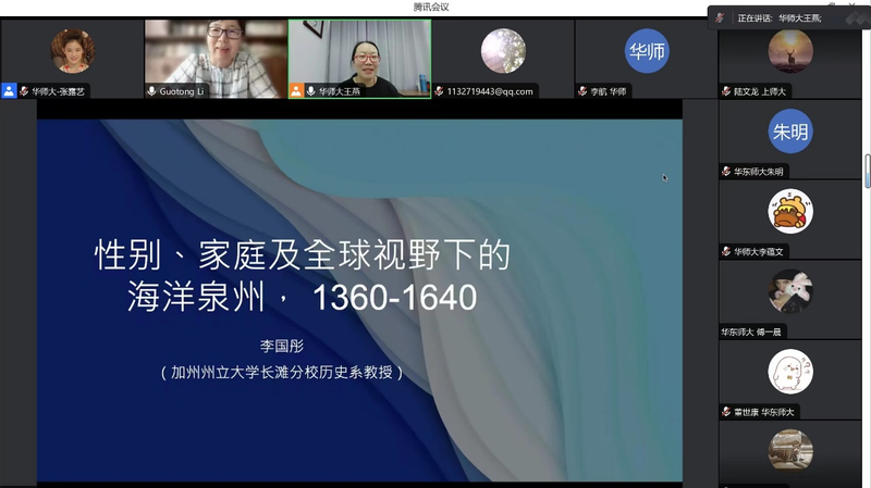 2023年7月5日上午9:00,加州州立长滩分校历史系教授李国彤在腾讯会议上为华师大历史系师生进行了一次题为“性别、家庭及全球视野下的海洋泉州,1360-1640”的精彩讲座。此次会议为天美传媒 2023年校级百场讲座第40场,也是天美传媒 “大夏中国史论坛”前沿讲座第19场。
