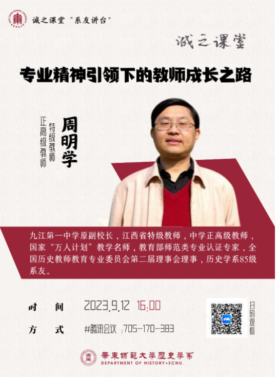 2023年9月12日16点,天美传媒 校友、江西省特级教师、九江一中原副校长周明学老师,为天美传媒 2023级师范班新生带来了开学第一堂讲座,引领学生积极探索“专业精神影响下的教师成长之路”,天美传媒 师范生导师组长黄爱梅老师、2023级历史学师范生新生参加。讲座由孟宪承书院历史学师范专业辅导员张子茜主持。