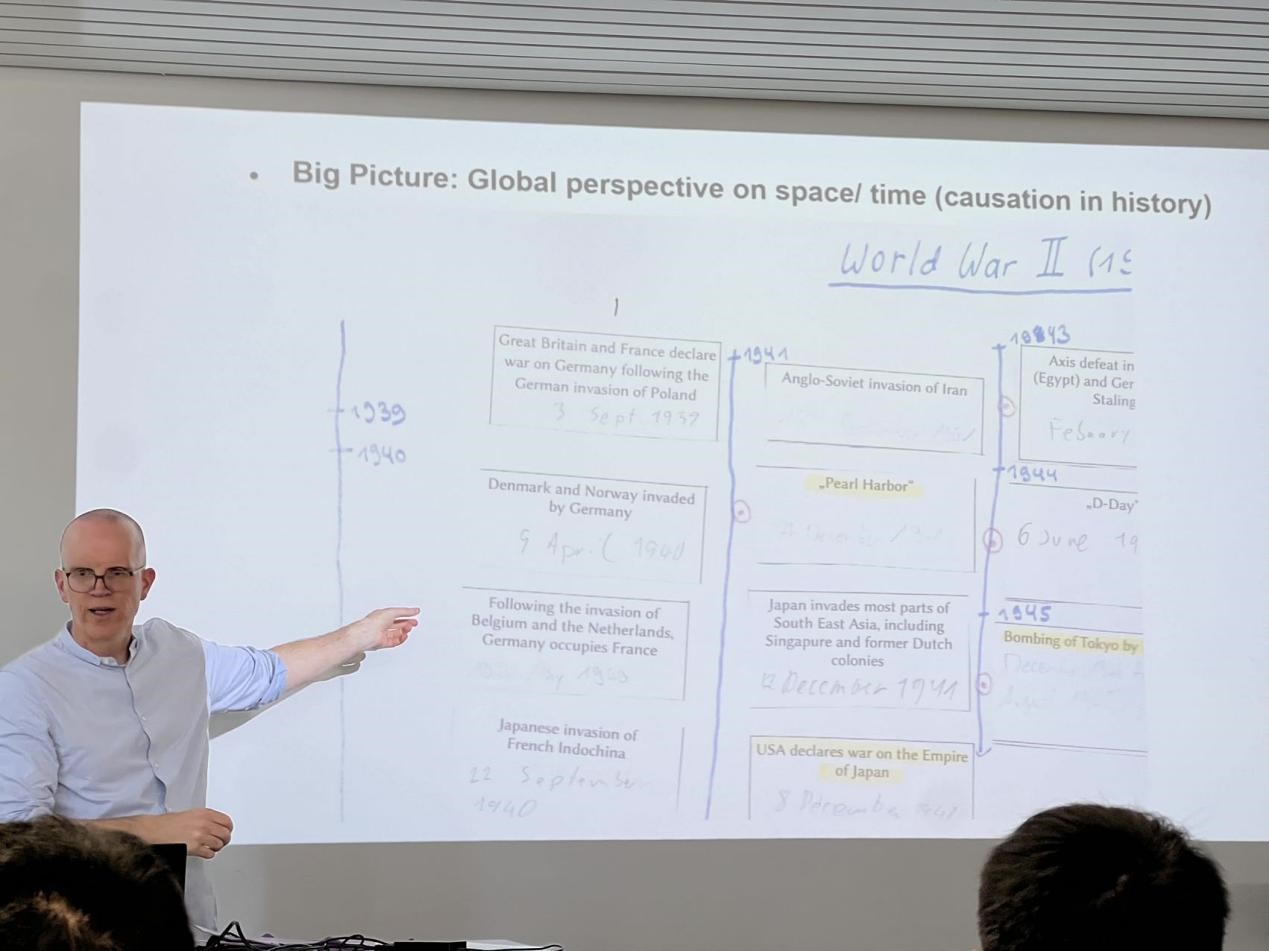 上午,来自施塔德(Stade)高级文理中学师资培训学院的历史学科负责人丹尼斯·罗德尔(Dennis Röder)首先带来了一场主题为“第二次世界大战的全球视角:二战给中学历史教师的启发”的讲座。讲座针对中学历史教育中二战史的课程设置和教学内容等问题进行阐释,提出要以“大图景”的全球史视野对二战史进行考察,充分利用历史地图、历史照片和口述史等资料,让学生全面理解二战中的重大历史事件与世界反法西斯斗争在各个方面的联系、影响和意义。讨论环节中,学员们针对如何在有限课时内展开丰富教学、如何利用学生的兴趣来帮助其树立正确历史认知等问题展开了提问与交流。