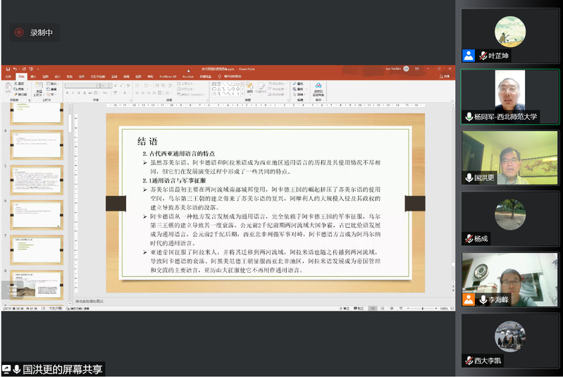 国洪更老师首先介绍了“通用语言”的定义及其产生的必要性——由于古代西亚地域广阔、族群众多,多种语言并存成为常态;但语言的差异并未阻碍古代西亚地区之间的交流,这得益于通用语言的使用。