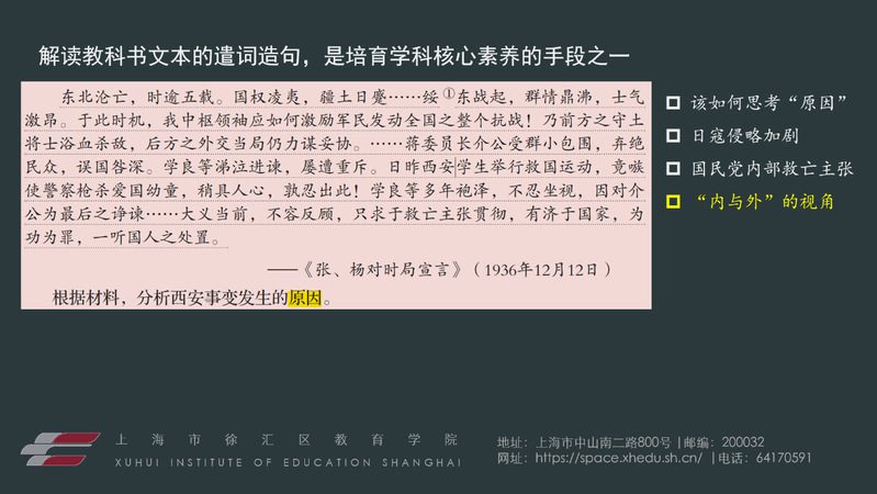 在讲座的最后一部分,宫老师谈到教师可以通过解读文本、分析内容等方式来训练并培养学生的史料实证、唯物史观等核心素养。以“西安事变”发生的原因为例,课文中谈到了日寇的侵略和国民党内部的救亡,教师可引导学生从内因和外因两个视角来考虑问题,培养“内”与“外”结合的思维方式。