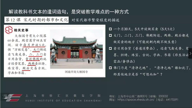 在第四部分,宫老师以“法国大革命”一课对拿破仑的评价为例,谈到学生可能对拿破仑的双重身份解读对产生困难,这时候应该回到教材文本,帮助学生理解这一概念。宫老师带领大家结合《人权宣言》与教材中关于《拿破仑法典》的文本表述,分析“人权”、“自由”、“法治”、“分权”等概念在《拿破仑法典》中的体现。接着,宫老师又以“宋元时期的都市文化”为例,谈到其难点在于如何描述宋代都市的繁荣程度,因此要通过解读经济现象来帮助学生理解。故宫老师通过一则描述了大相国寺售卖日用杂货和奢侈品的文本来帮助理解。通过“宋代经济的发展”和“清朝前期社会经济的发展”两课,宫老师提醒大家关注分析遣词造句,注意“发展”所体现的比较意味。