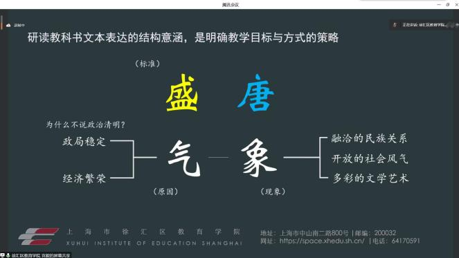 再次,宫老师以“明朝对外关系”为例,谈到在这一课的子目中的表述,实际上了国力强弱的与对外政策的变化,反映出不同阶段国力的强弱变化,可以此来进行教学策略的排兵布阵。最后,宫老师以“盛唐气象”为例,谈到研读文本结构,还可以采用聚焦于字词的方式。比如,授课可以破开“气”与“象”的关联。