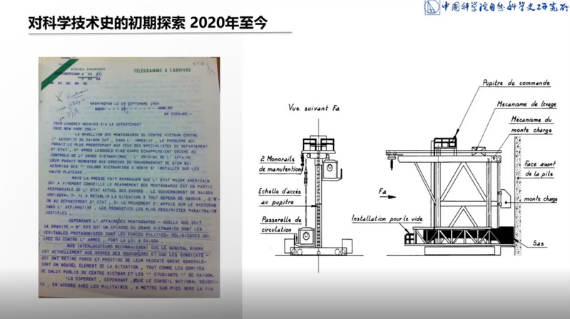 为使同学们更加直观地了解科学技术史的研究方法,李云逸博士对照展示了法国外交部档案馆的电报截图和用于装卸燃料的机械示意图。传统的冷战史研究注重档案文献的解读和利用,而科学技术史则着重从设计图纸中挖掘信息。李云逸博士目前重点关注冷战史和科学技术史的文献史料,并在此基础上进行研究。