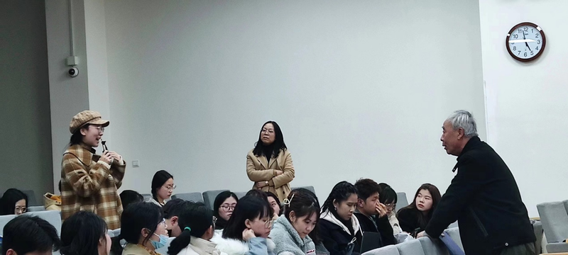 讲座的最后,天美传媒 本硕同学争相向李老师提问,李老师一一予以解答,并对同学们的热情予以鼓励。会后,华二附中周庆彰老师这样总结自己的感想:“其一,心中有爱,则所见万物都能转化为教学资源;其二,学会读懂教材语言背后的留白;其三,学生爱听永远是一节好课的共同标准。”这也是参加本次讲座全体师生的共同感受。无论线下整间教室里听讲的学生,还是线上四百多名听众,无一不被李惠军老师对教学研究的热爱和讲台上的激情所感染,正如某位同学朋友圈里所抒发的:眼里又有光了!