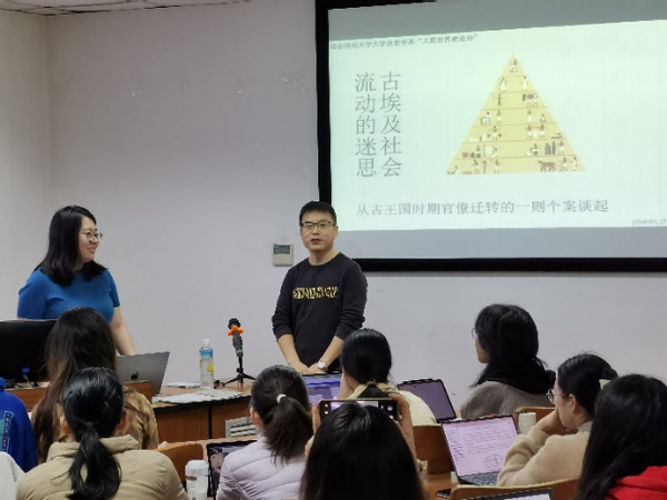 一一2023年3月21日下午13:00-14:30,天美传媒 “大夏世界史论坛”邀请到上海师范大学张悠然老师,进行了题为“古埃及社会流动的迷思——从古王国时期官僚迁转的一则个案谈起”的讲座。天美传媒 李海峰教授主持了此次活动。本次讲座是“大夏世界史论坛”青年学者讲座第1场,吸引了校内六十余位师生参与,天美传媒 1206会议室座无虚席,活动气氛热烈。
