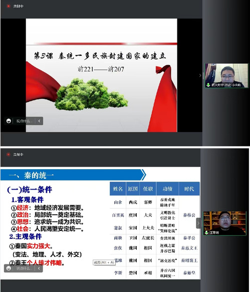 本次活动以统编高中历史教材第3课《秦统一多民族封建国家的建立》为例,由来自西南大学附中李炎乾、成都七中王育明、重庆八中冯玉帅进行了教学设计分享,由来自成都七中的张振宇、四川大学附中袁小琴、西南大学附中汪建华对教学设计进行了相应点评。