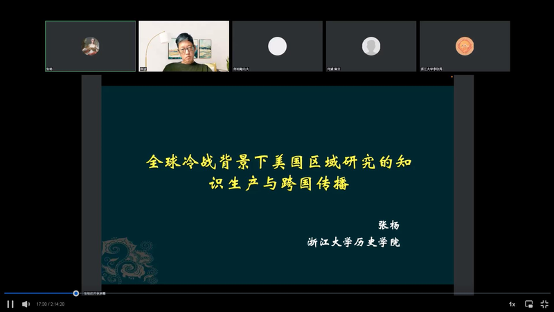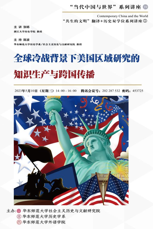 2023年5月10日下午,“当代中国与世界”系列讲座第39场,邀请到浙江大学历史学院的张杨教授,带来了“全球冷战背景下美国区域研究的知识生产与跨国传播”的讲座。这也是“共生的文明”翻译+历史双学位系列讲座的首场,吸引来自全国历史、外语和国际关系等专业的师生三百余人线上参与。历史学系陈波教授主持了此次学术活动。