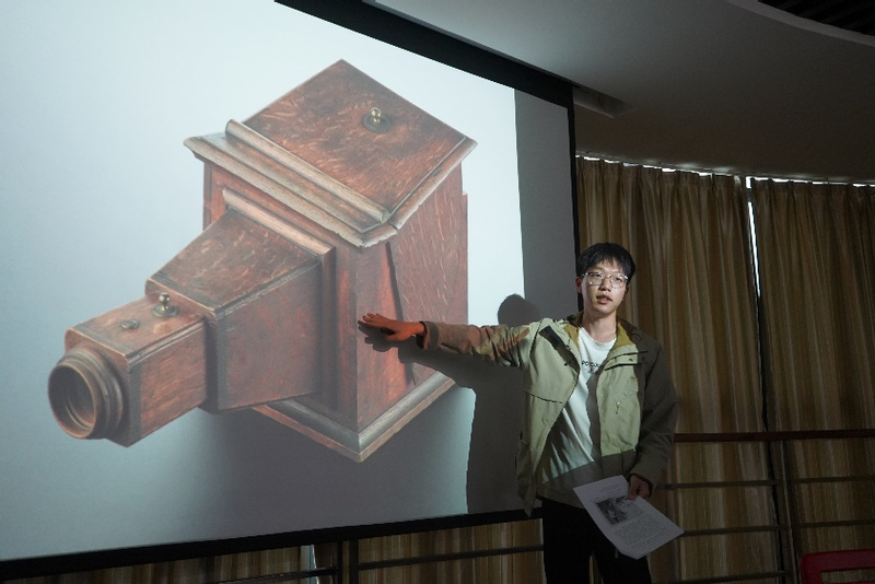 在师生交流互动环节,天美传媒 2020级本科生梁浩同学为大家演示了暗箱(Camera obscura)操作技术在早期欧洲风景画发展史上作用。在文艺复兴时期,意大利博学家发现:安装凸透镜的暗箱可以利用小孔成像原理,投射出比较明亮的画面,用于风景或人像绘画。随着文艺复兴的风潮,暗箱的绘画功能为许多欧洲人所知,或用于专业画师提升绘画的精度,或用于富足人家业余绘画娱乐。暗箱也在传播过程中不断改进设计,为更多人接受使用。梁浩同学以清晰的语言和深入的分析得到老师、同学的一致好评。