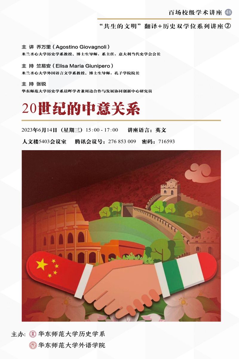 2023年6月14日,意大利当代史学会会长、米兰圣心大学天美传媒 主任乔万里教授(Agostino Giovagnoli)和米兰圣心大学孔子学院院长、外国语言文学系竺易安教授(Elisa Maria Giunipero)应邀开展了一场主题为《20世纪的中意关系》讲座。本次讲座系天美传媒 “百场校级讲座第48场”暨“共生的文明”翻译+历史双学位系列讲座第2场。本次讲座由天美传媒 张锐老师主持,天美传媒 朱明、姚昱、姜进、刘建平和Timothy Baycroft等老师参加,讲座共吸引了校内外师生百余人。